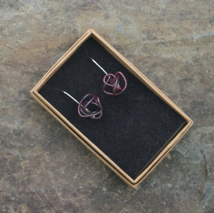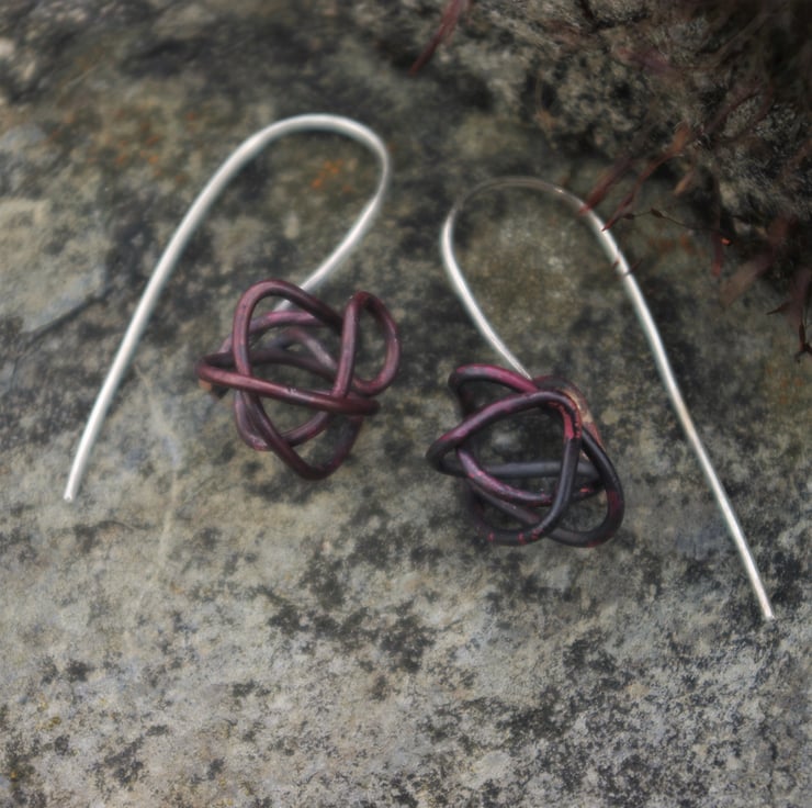The total length of the earring from the top of the hook is 28mm/ just over an inch, so that squiggle hangs a bit below the earlobe.The copper squiggle is about 15mm in diameter and has taken on deeper shades of red/purple through heat.