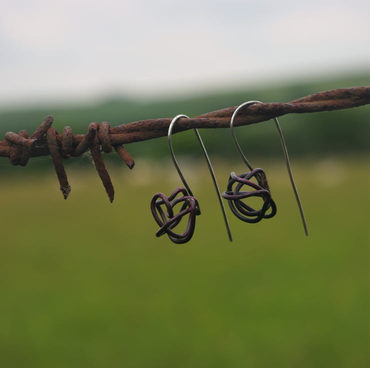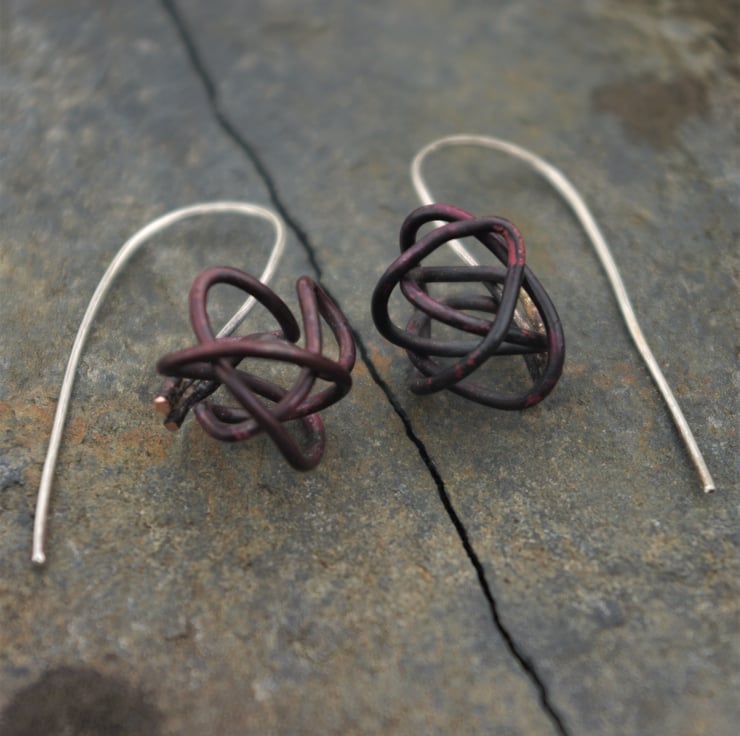 Originally inspired by the tangled wire fencing on my walk, I have soldered a copper squiggle, onto a sterling silver hook.
