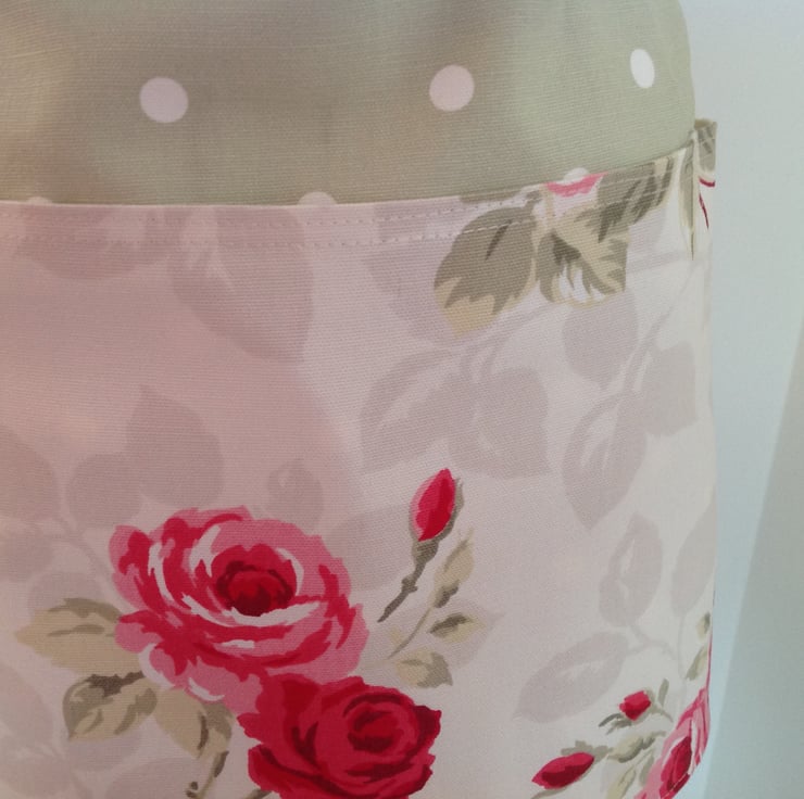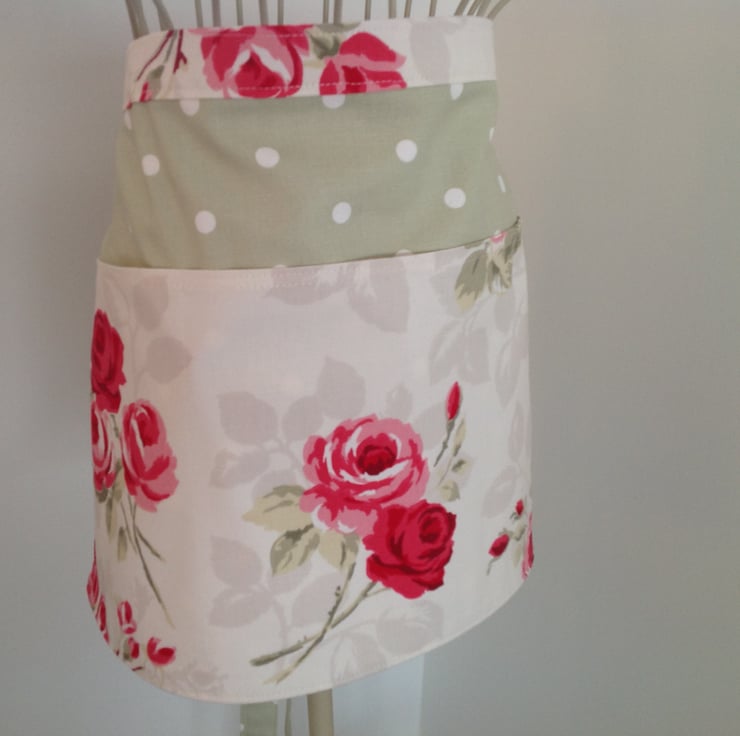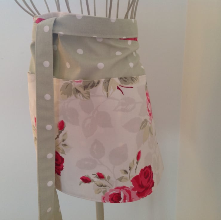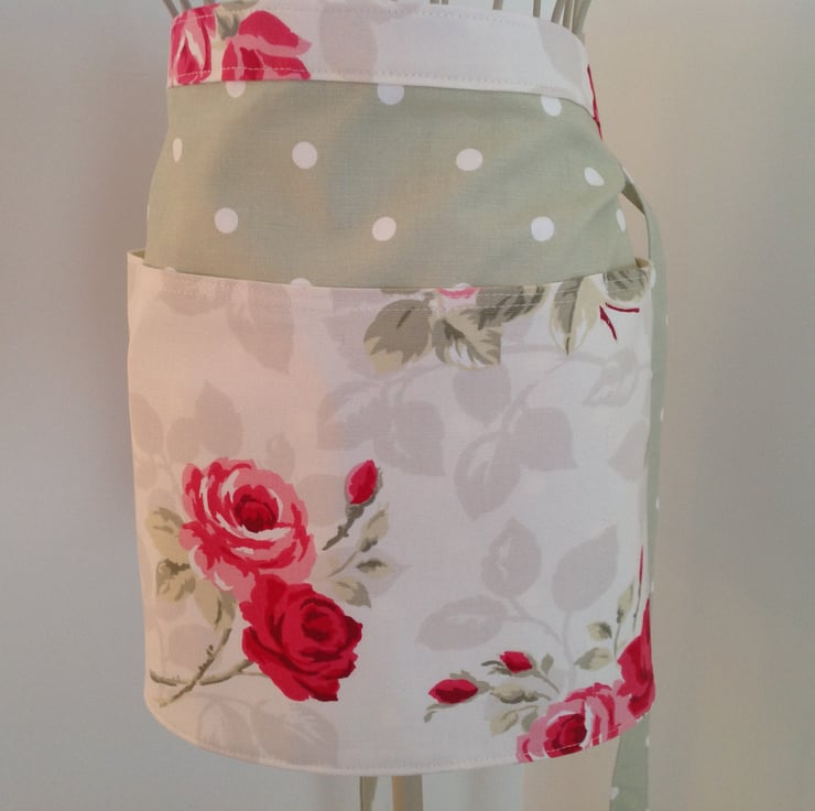 Beautiful fully lined half apron with three front pockets and extra long straps. It can be tied at the front as well as at the back. Made from 100% cotton combining a cream fabric with red rose detail on a green polka dot background. This apron is fully lined both inside the pockets and on the reverse. The front pocket is divided into three useful sections.