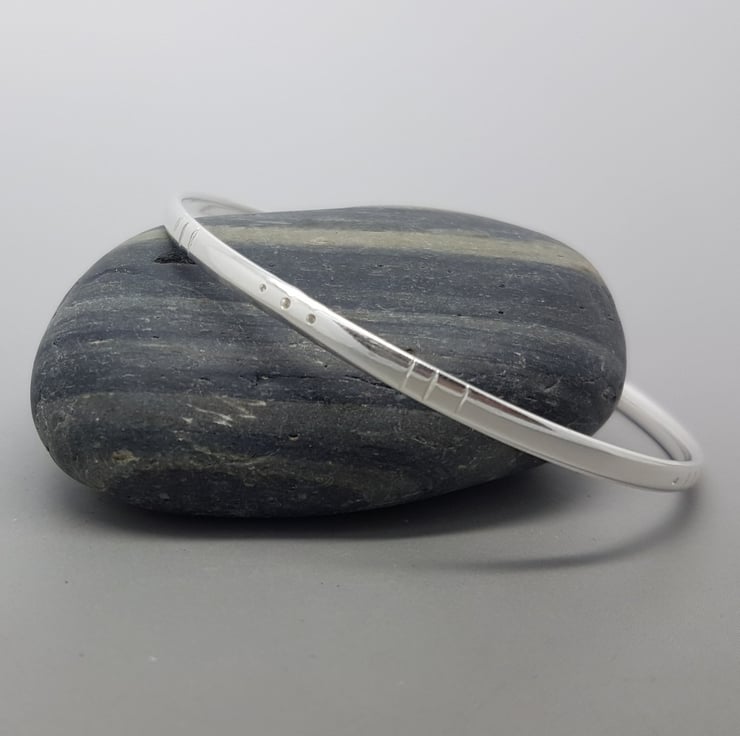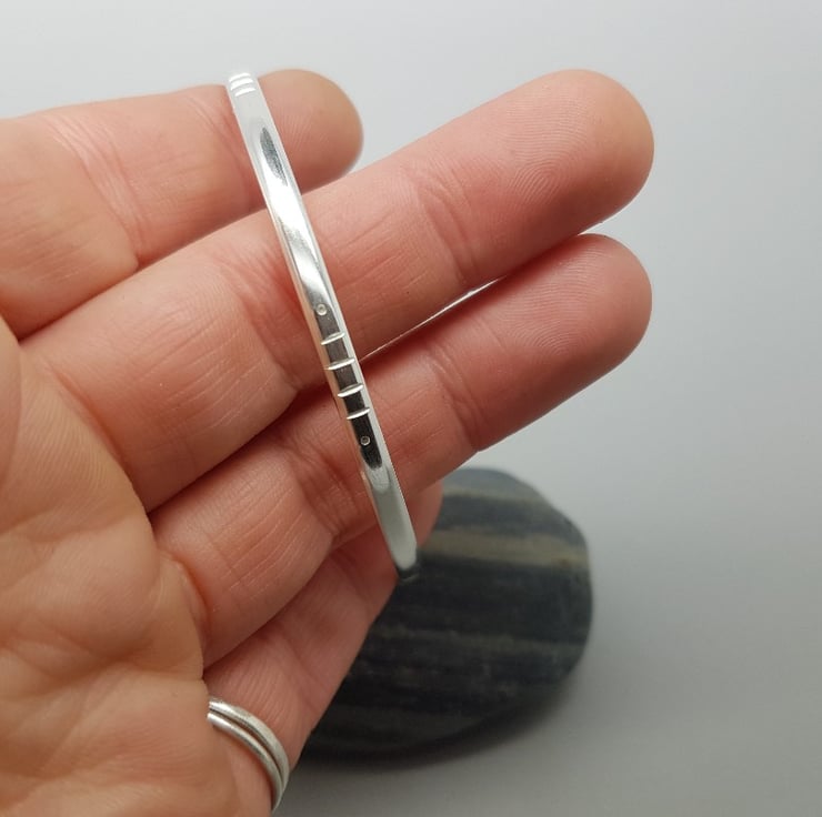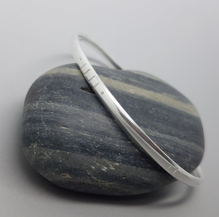 This beautiful bangle is solid Sterling Silver, with a tribal design and a flat oval profile.