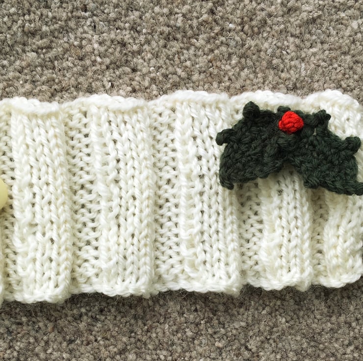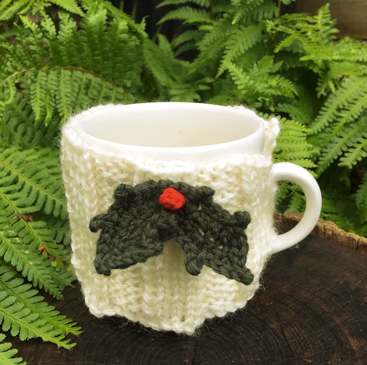 I have hand knitted the cream mug cosy and attached two crochet holly leaves and a red berry. There is a cream button and buttonhole for fastening around the mug. Made with a lovely wool mix yarn which will keep the mug nice and warm. Will fit a standard mug and measures approx 8cm in height.