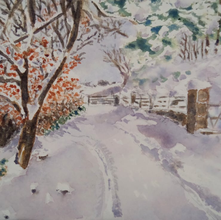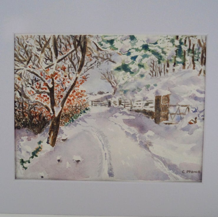 This is my original small watercolour painting of a rural winter scene, showing a snowy country lane bordered by trees and snow topped fences, leading to a wintry horizon. A lovely seasonal painting for Christmas.
