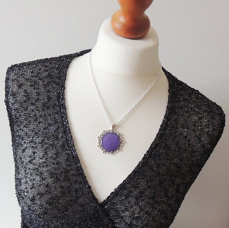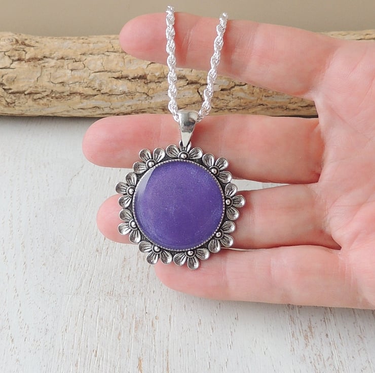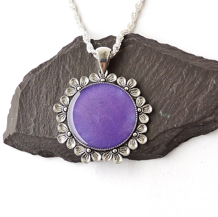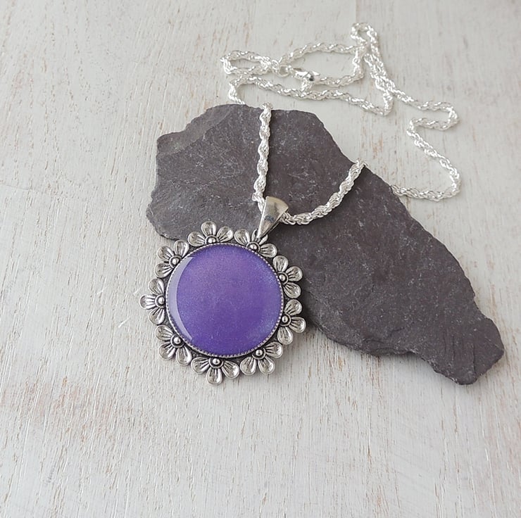 I made it with purple resin in the cup of an antique silver plated pendant bezel and then sealed it with a coat of clear resin.