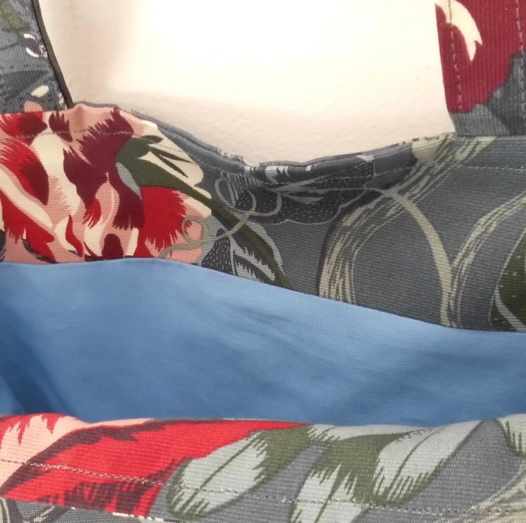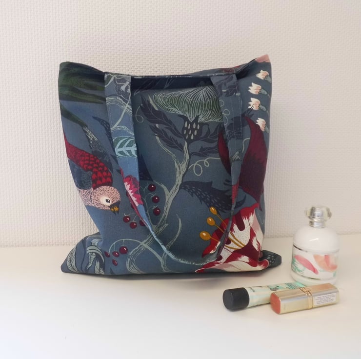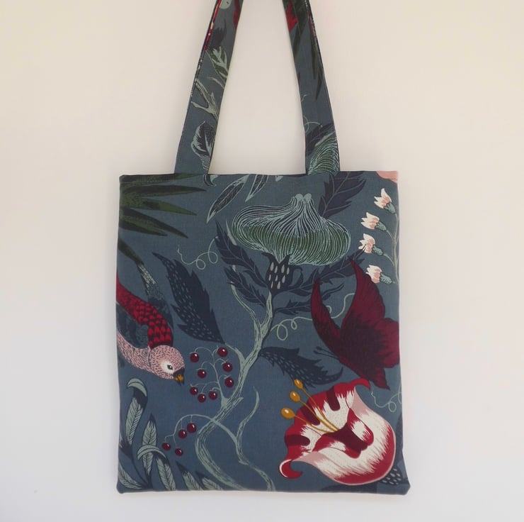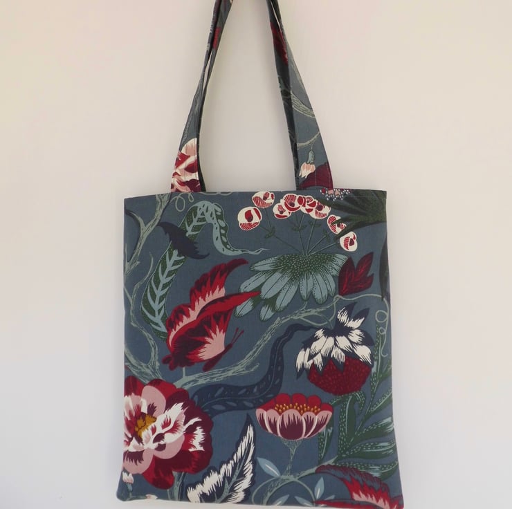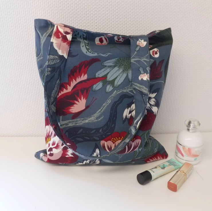 A basic tote bag made using a gorgeous strong cotton fabric from Ikea. It has a deep blue/grey background and a contemporary large floral/birds/butterflies print.