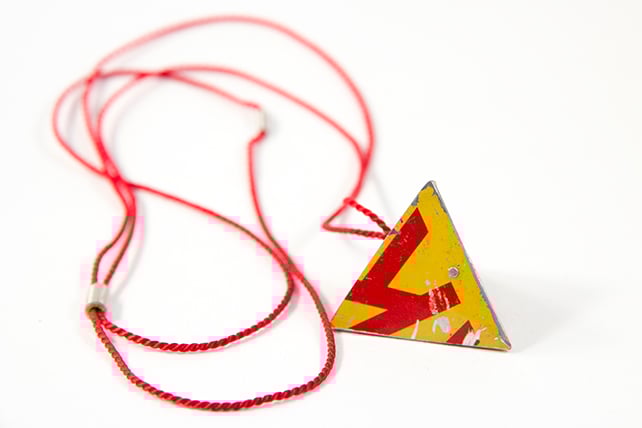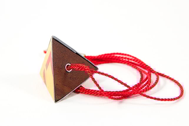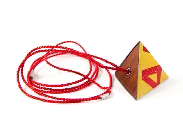 Made from an old Ogdens Redbreast Flake tobacco tin. A 4 sided pyramid tetrahedron. It hangs beautifully from a red silk cord.
