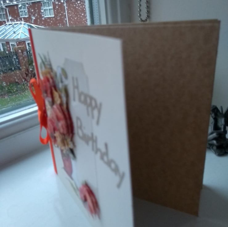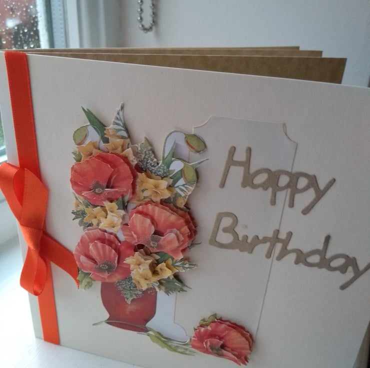 A completely handmade and uniquely designed card. A beautiful vase of orange flowers decoupage mounted onto quality cream card. Happy birthday die cut from gold paper. Finished off with orange ribbon and bow