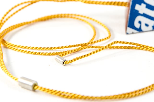 The cord goes easily over the head. And has a silver sliding tube to shortened the necklace length to your preferred height.