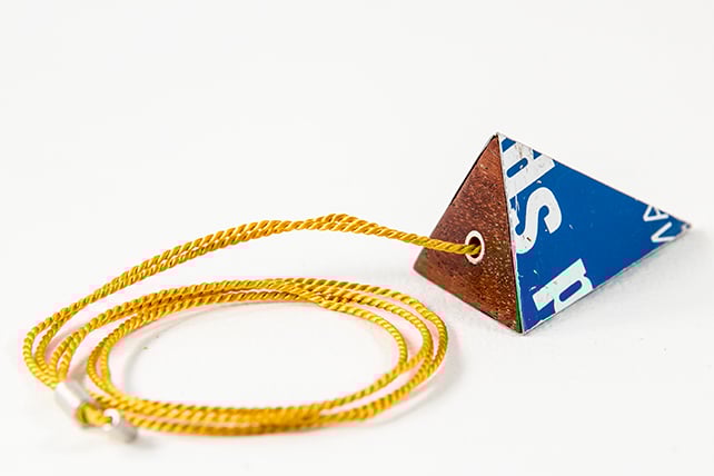 Made from an old methylated spirits tin. A 4 sided pyramid tetrahedron. It hangs beautifully from a yellow silk cord.