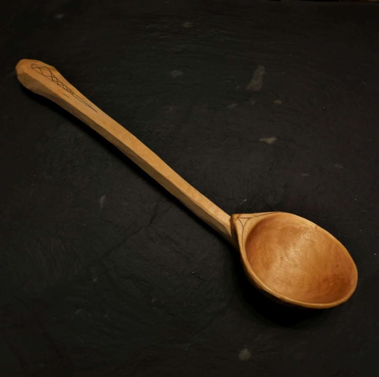 A cooking or serving spoon handcarved in the traditional Welsh cawl spoon style with a kolrosed design on the handle.