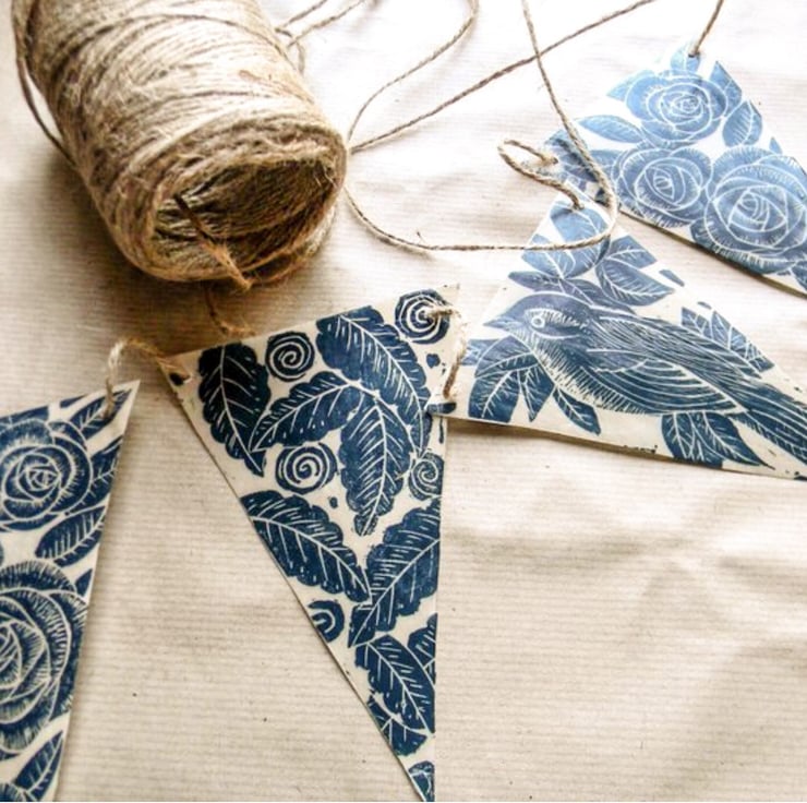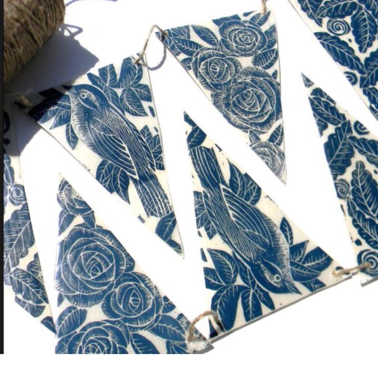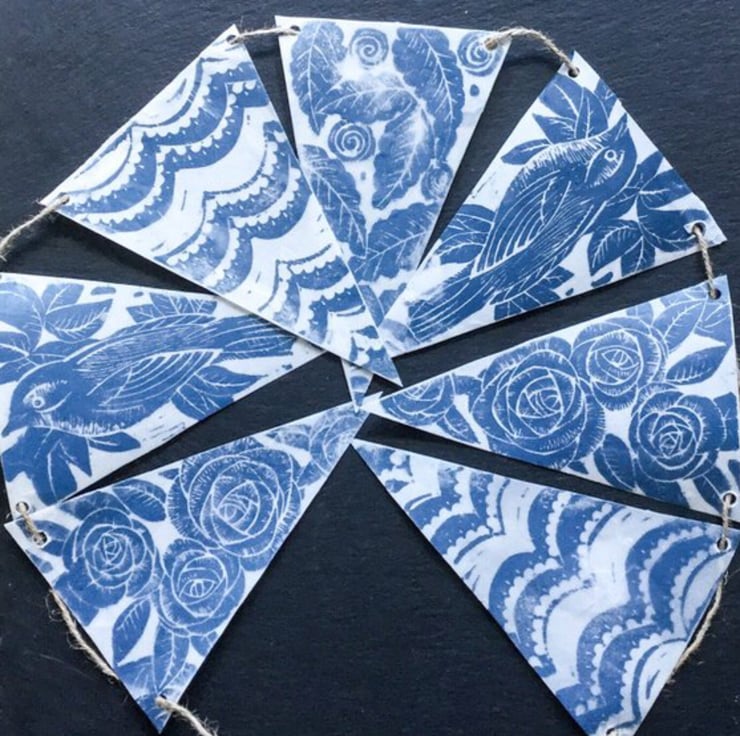 This unique bunting has been hand printed in blue ink, waxed and strung with natural hessian string. Hand printed with Roses, Birds and floral elements.