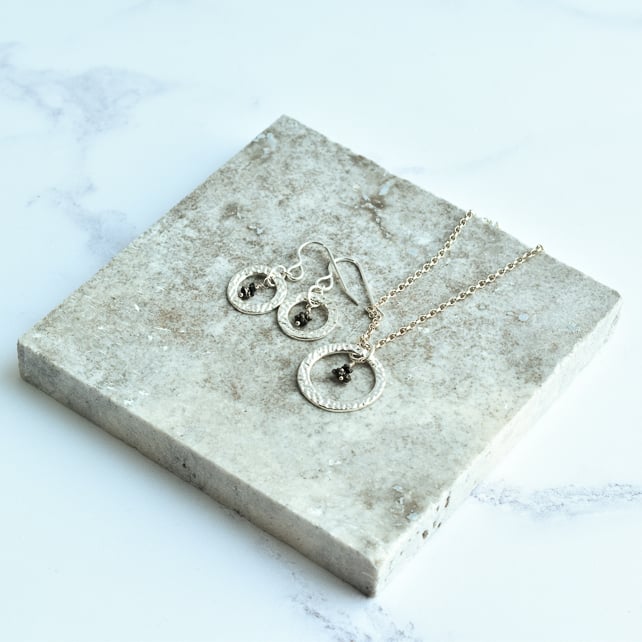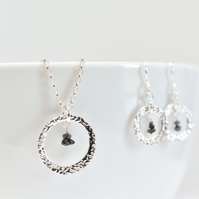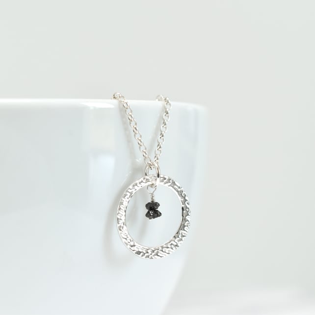 Two tiny Black Diamond nuggets sit with a Fine Silver circle, suspended from a Sterling Silver chain. The silver circle is handmade by me and I've textured it so it catches the light and adds sparkle. Fine Silver is 99.9% pure silver and has the advantage of not tarnishing as readily as Sterling Silver.