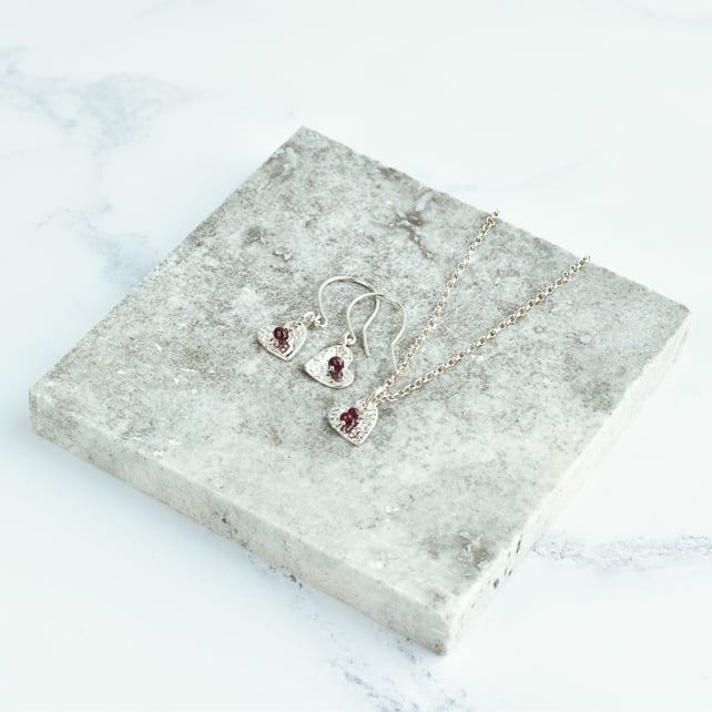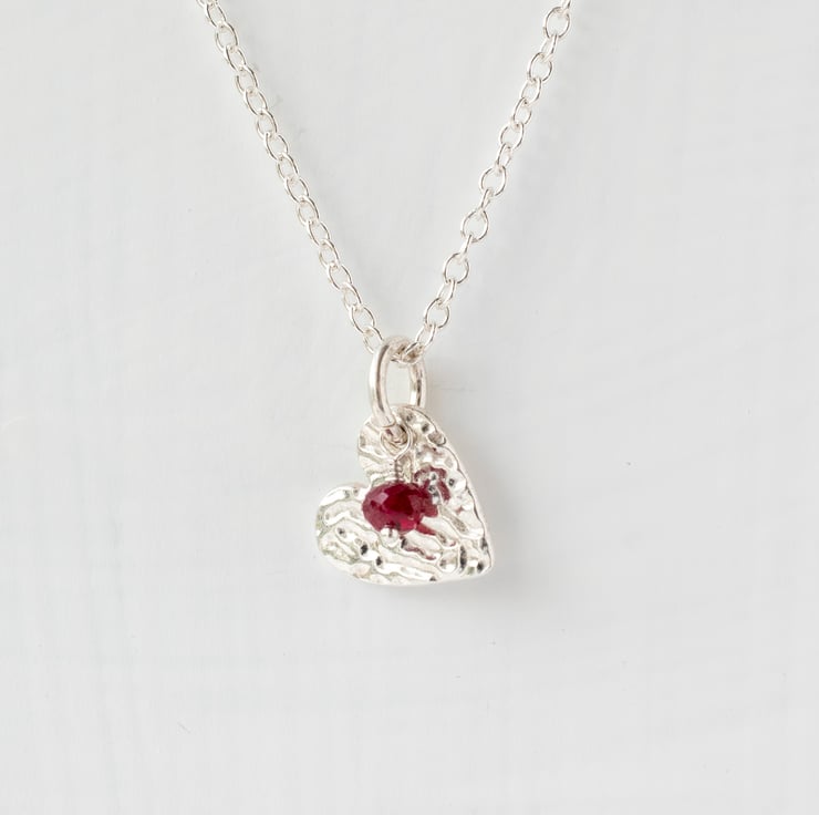 Two small Rubies sit on top of a Fine Silver heart, suspended from a Sterling Silver chain. The silver heart is handmade by me and I've textured it so it catches the light and sparkles prettily. Fine Silver is 99.9% pure silver and has the advantage of not tarnishing as readily as Sterling Silver.