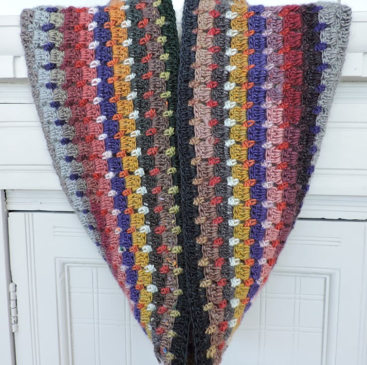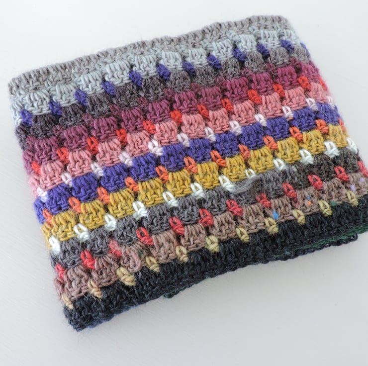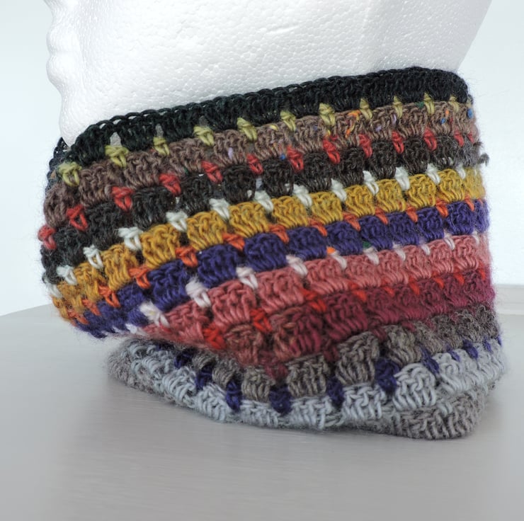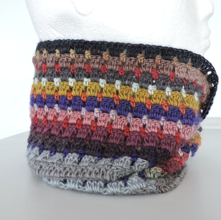 This soft and warm infinity scarf has been crocheted in a double knit acrylic and wool blend yarn. Lovely multi coloured scarf graduating through russet, mustard, taupe, mauve, pinks, grey, charcoal and cream.