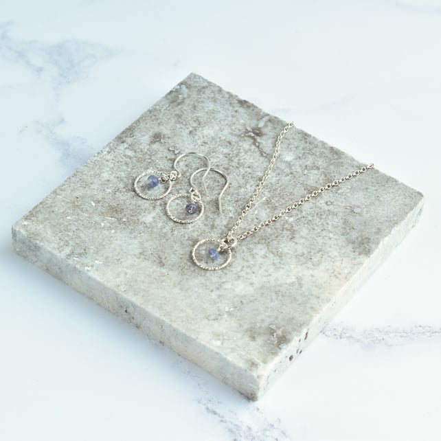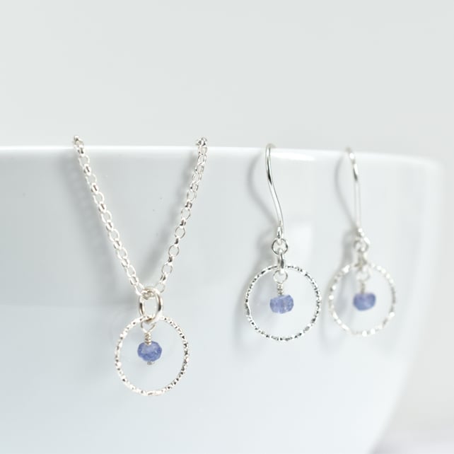 A sparkling faceted Tanzanite sits on top of a slim Sterling Silver Circle, suspended from a Sterling Silver chain. The silver circle has been textured so it catches the light and sparkles prettily, while also being delicately minimalist.