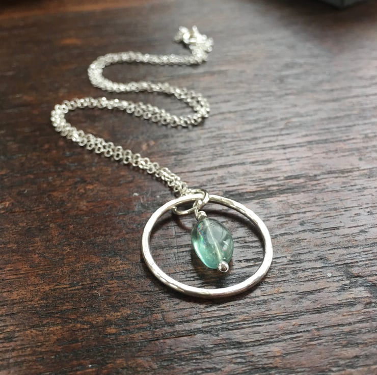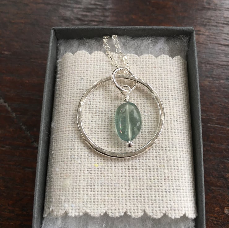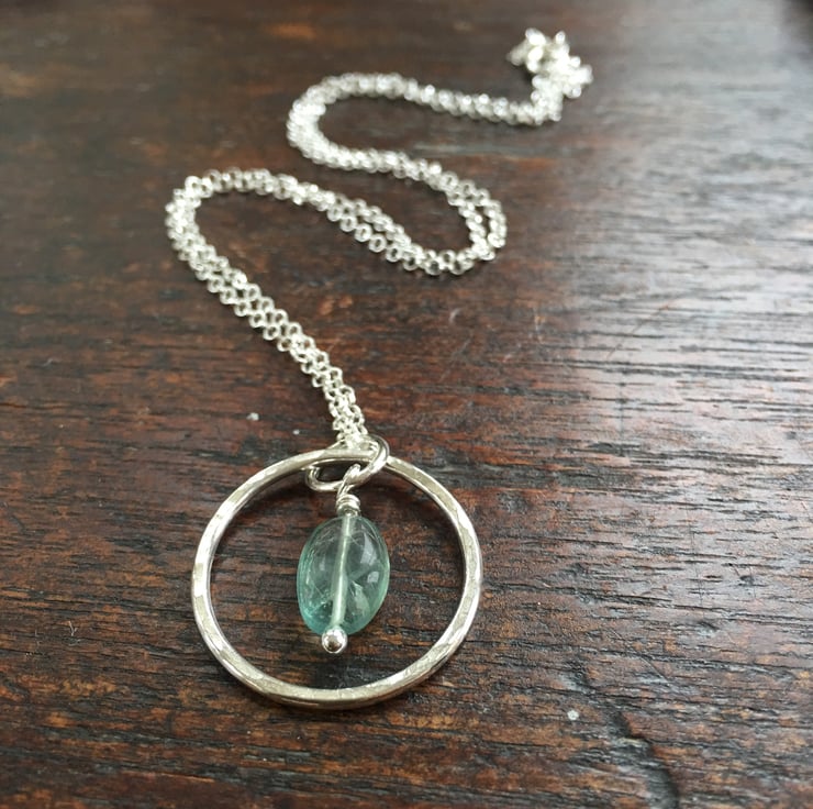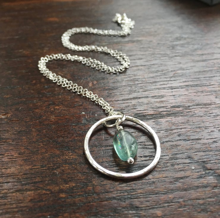 A pretty handmade sterling silver pendant featuring a beautiful little nugget of aqua coloured fluorite. Fluorite is a semi precious gemstone which comes in a range of colours and glows beautifully in the light. This one has been chosen for its lovely sea green colour reminiscent of sea glass.