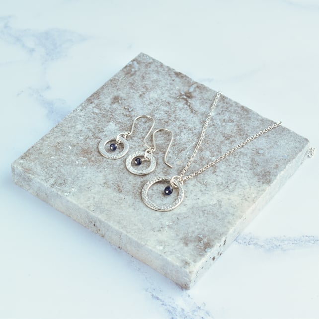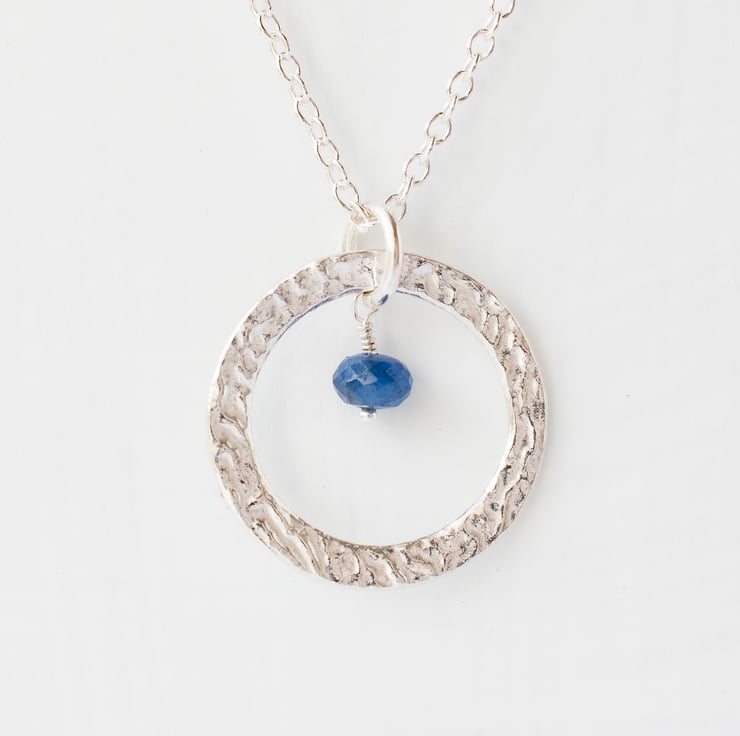 A sparkling faceted Blue Sapphire sits on top of a Fine Silver Circle, suspended from a Sterling Silver chain. The silver circle is handmade by me and I've textured it so it catches the light and sparkles prettily. Fine silver is 99% pure silver, and has the advantage that it tarnishes less readily than Sterling Silver (92.5% pure silver).