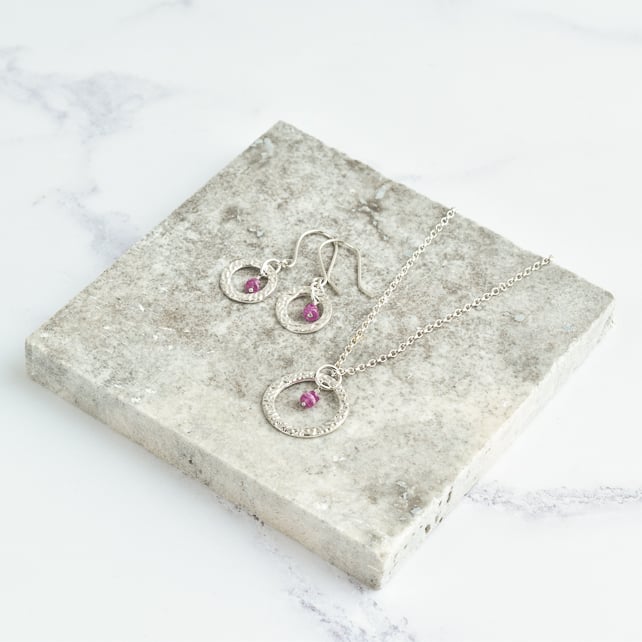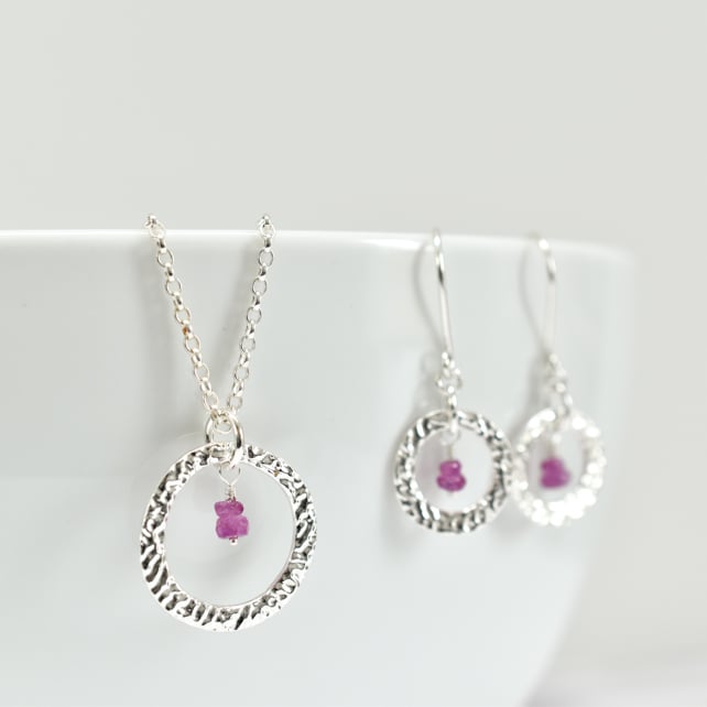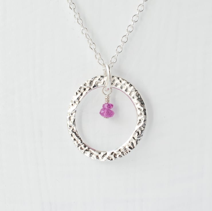 Two tiny sparkling faceted Pink Sapphires sit on top of a Fine Silver Large Circle, suspended from a Sterling Silver chain. The silver circle is handmade by me and I've textured it so it catches the light and sparkles prettily. Fine silver is 99% pure silver, and has the advantage that it tarnishes less readily than Sterling Silver (92.5% pure silver).