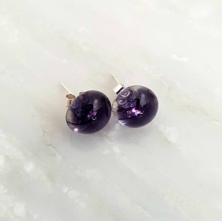 Measuring approx 8 mm in diameter these dainty earrings are made from a stunning transparent glass which is fused in a my kiln for up to 12 hours.