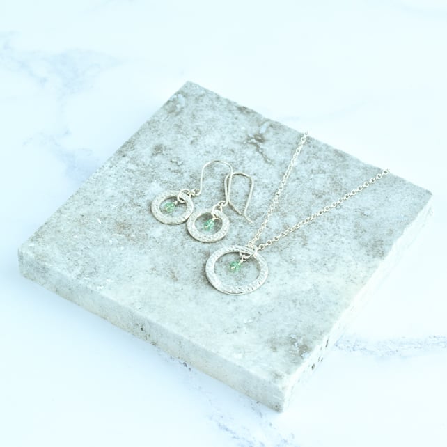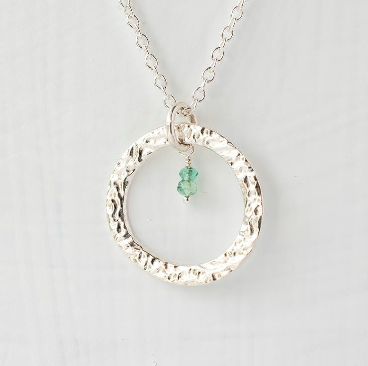 Two tiny sparkling faceted Emeralds sit on top of a Fine Silver Circle, suspended from a Sterling Silver chain. The silver circle is handmade by me and I've textured it so it catches the light and sparkles prettily. Fine silver is 99% pure silver, and has the advantage that it tarnishes less readily than Sterling Silver (92.5% pure silver).