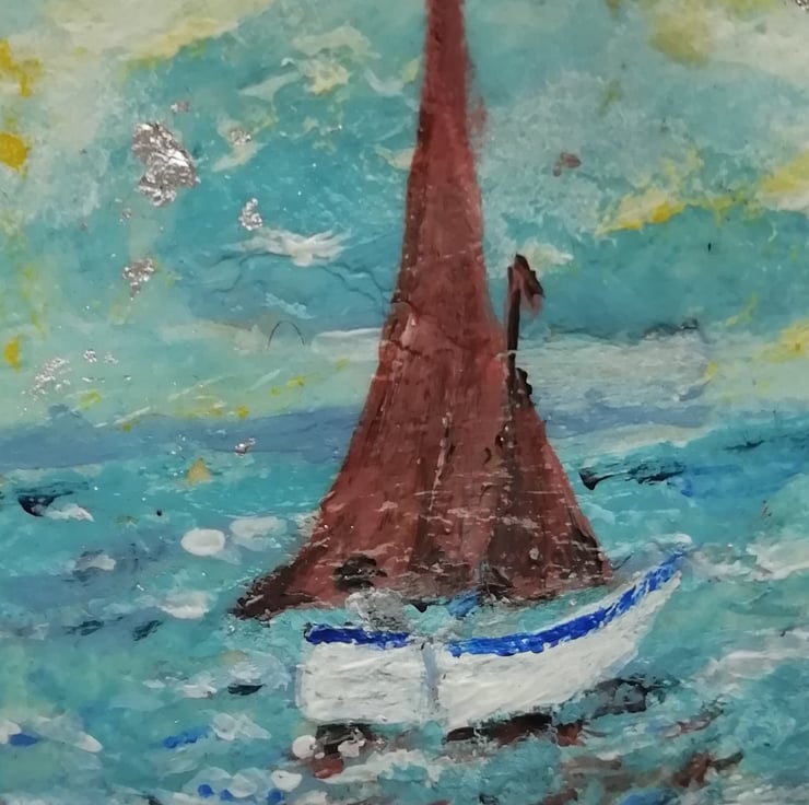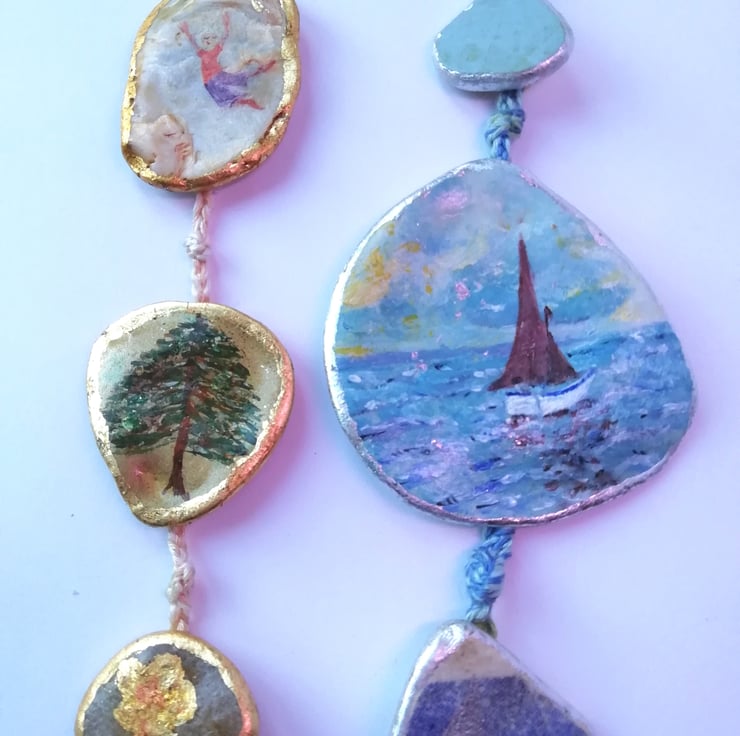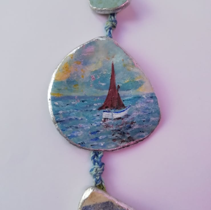 This decoration has a hand painted boat on a shell with sea pottery which have been gilded with silver leaf and hangs from a finger knit cord. Total length is 24.5cm.