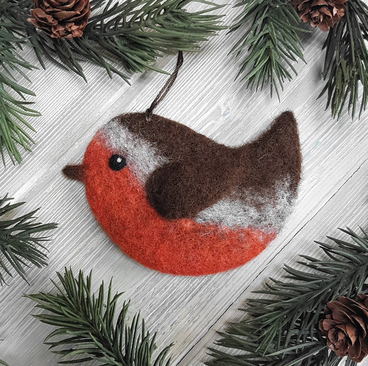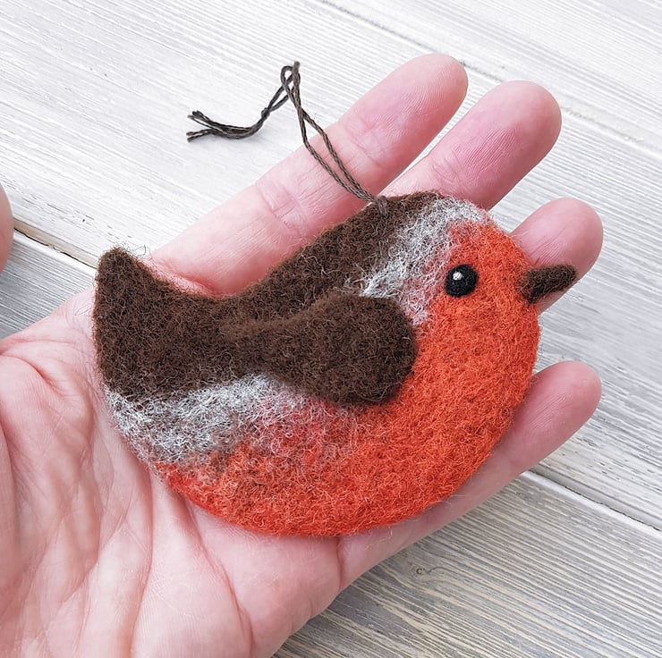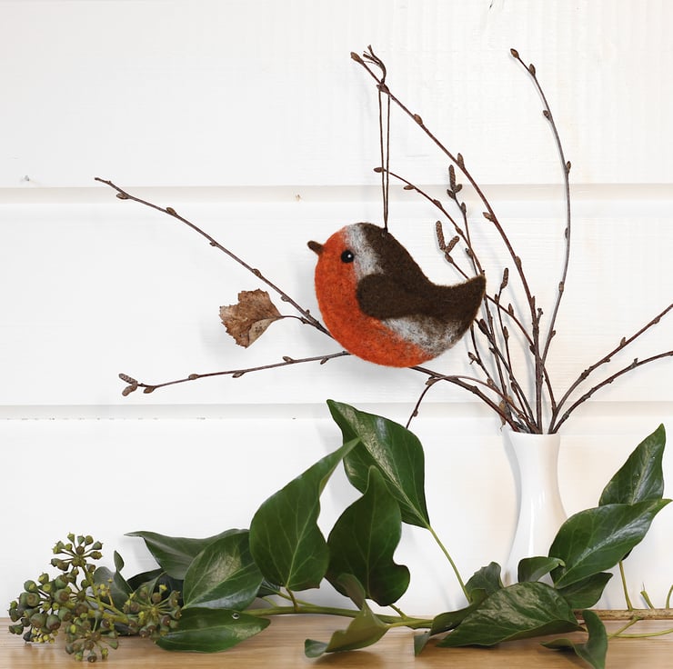 Ralph is a very cheerful robin and would love to brighten up your home. You could hang him on some twigs in a vase or on a door handle all year round, or he could decorate your Christmas tree or a branch for the festive season. He’s been painstakingly created from loose wool fibres by stabbing carefully with a fine, barbed felting needle till all his colours have blended beautifully together so that he has his own personality. He has a twinkle in his eyes and thinks he is very handsome.