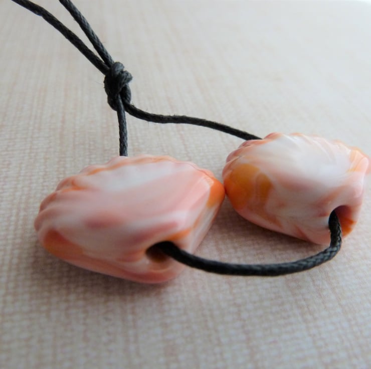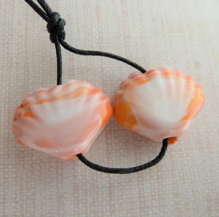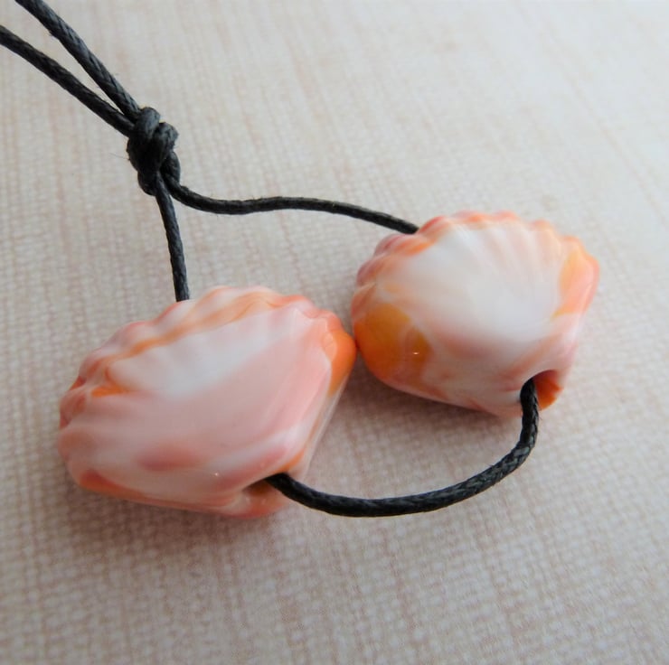 A pair of lampwork glass beads made with orange streaky glass and shaped into shells using a brass press.
