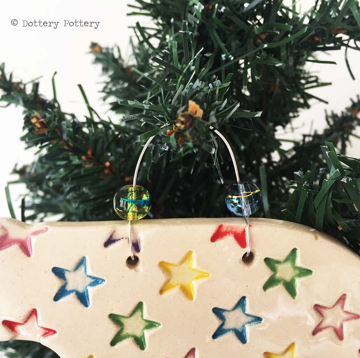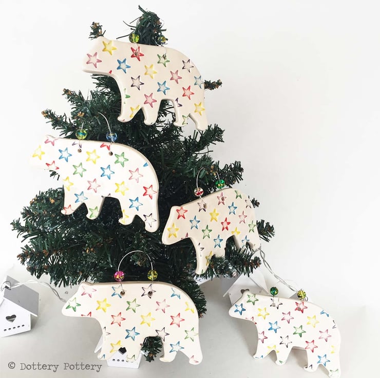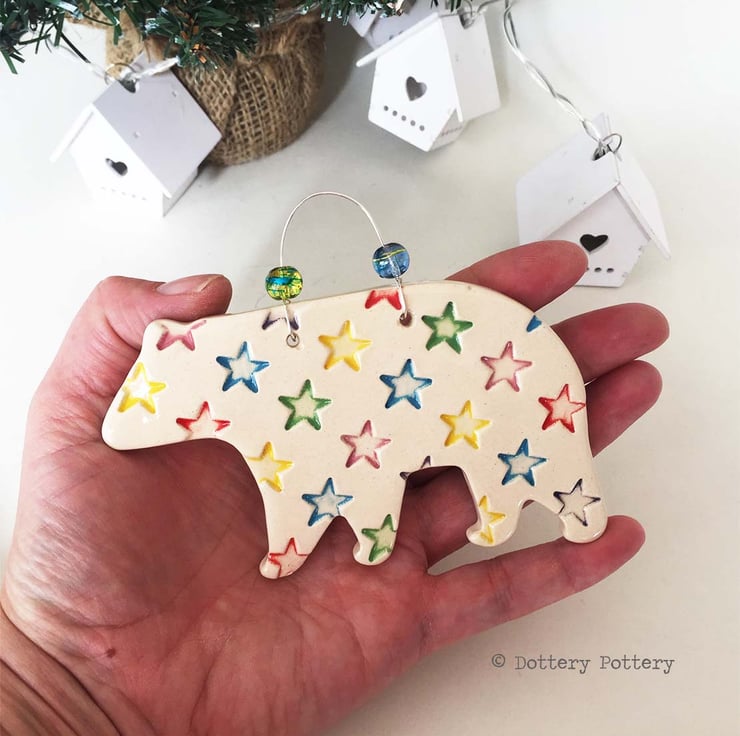 This cute Christmas themed Polar bear is made from white earthenware clay and decorated with bright stars It has been fired twice and finished with a rich, glossy glaze. It measures 11cm x 10cm x 0.7cm deep and hangs from a silver wire with coloured glass beads