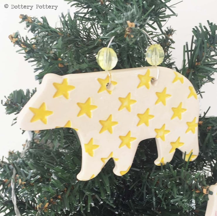 This cute Christmas themed Polar bear is made from white earthenware clay and decorated with yellow stars It has been fired twice and finished with a rich, glossy glaze. It measures 11cm x 10cm x 0.7cm deep and hangs from a silver wire with yellow beads