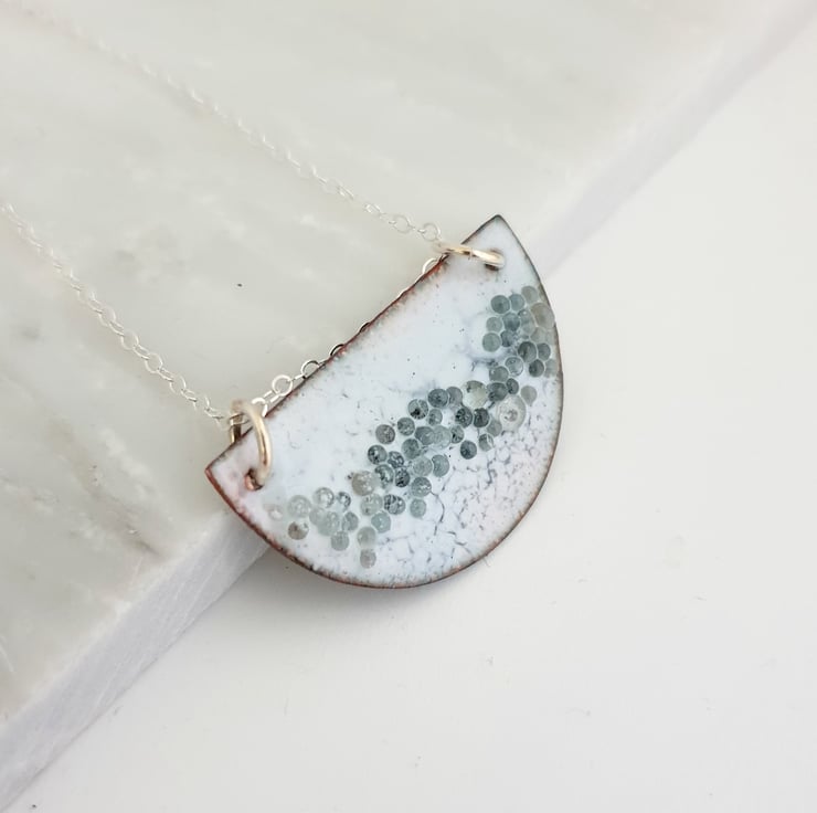 Made with different vitreous enamels in varying shades of grey, each is layered and then kiln fired before glass is added before the final firing, creating fantastic texture that catches the light.
