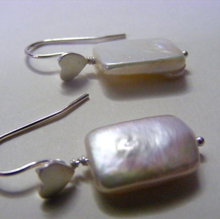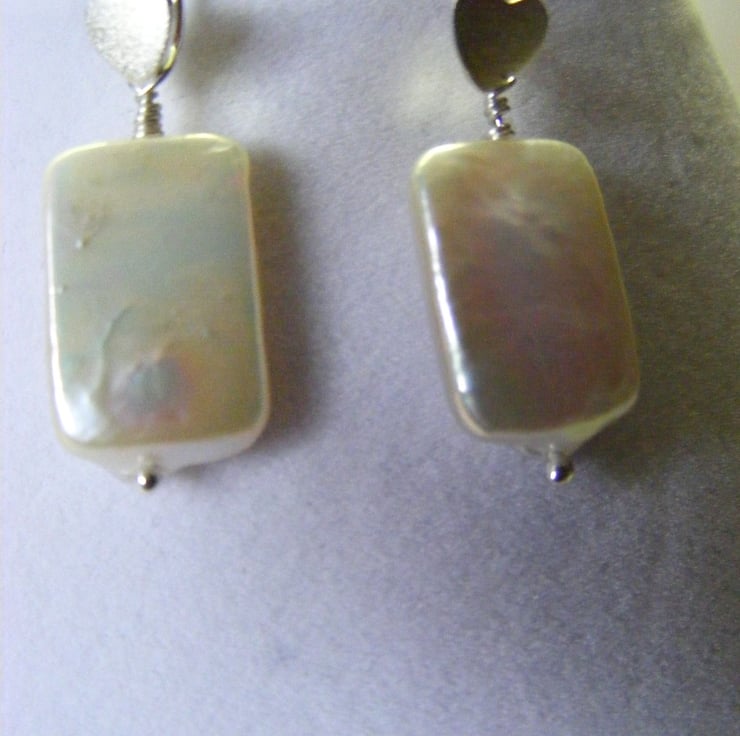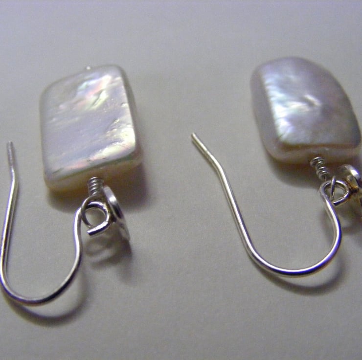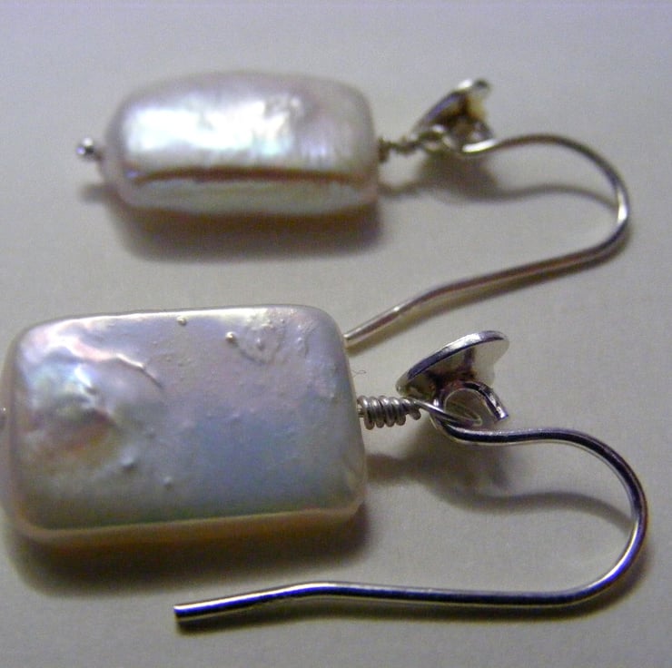 Earrings are made with freshwater cultured rectangle pearls and threaded on silver plated headpins. Attached ear wires are 925 stamped sterling silver.