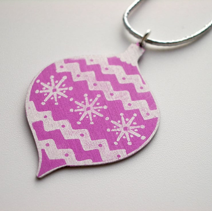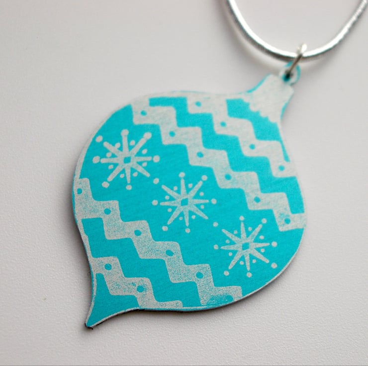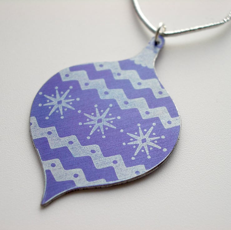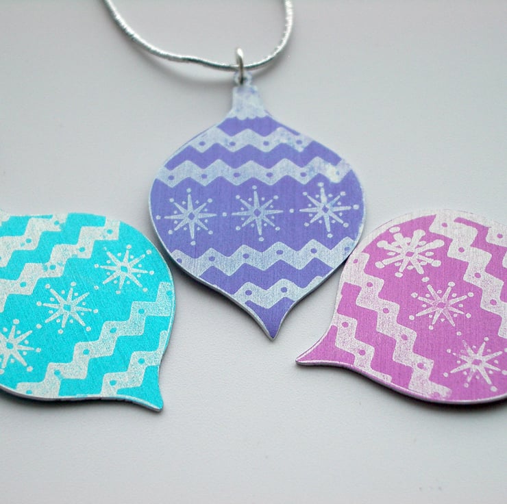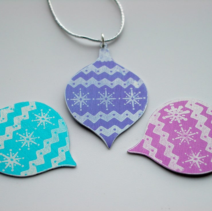 These cute little Christmas aluminium baubles are hand made from anodised aluminium which I have dyed in turquoise, purple and pink and printed with a festive pattern. I cut out the bauble shapes by hand with a piercing saw, file the edges and attach them to a festive silver string. The baubles measure 2.8cm x4.4cm. The string is approximately 5-6cm in dangle length.