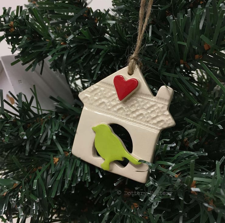 This little bird house decoration is made from white earthenware clay and finshed with a cute little heart and a bright bird. It has been fired twice and finished with a glossy glaze for a lovely smooth finish. It measures 7.5 x 7cm and hangs from rustic brown string