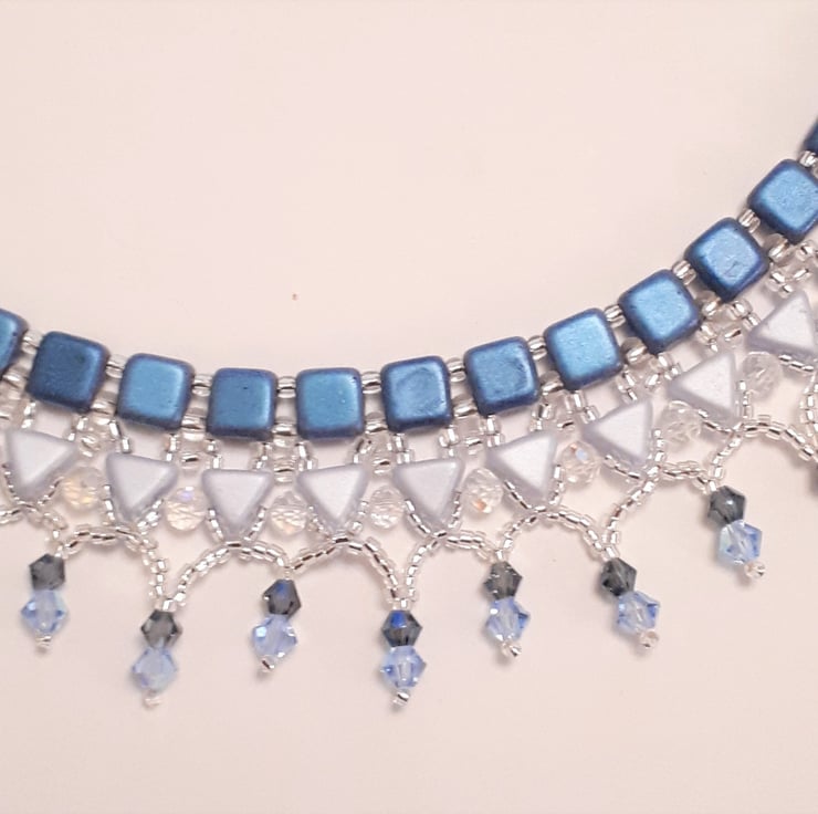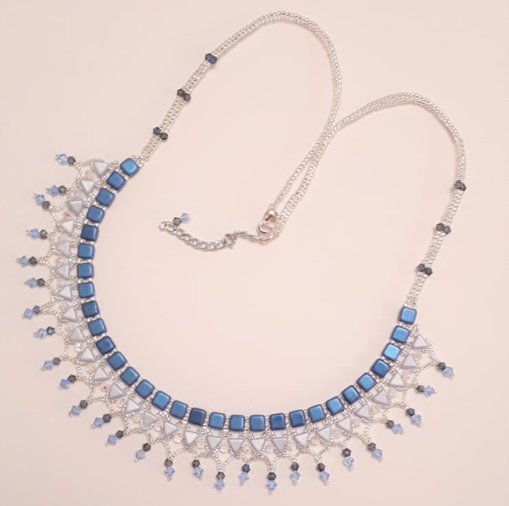 Egyptian style collar necklace in shades of blue. Made from Czech tile and kheop beads, with 2 different colours of crystals, which really catch the light and sparkle. Measures approx 50cm / 20" long and has an extender so can be worn longer if required. Fastens with a silver tone heart shaped trigger clasp. Looks stunning on!
