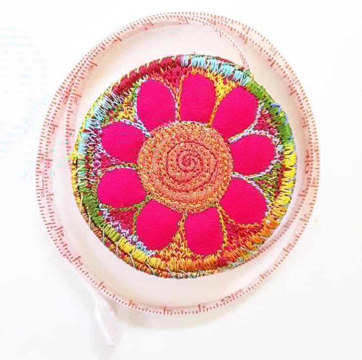 Made from layers of fabric including hand dyed Egyptian cotton and silk fabrics using the free machine embroidery style of sewing