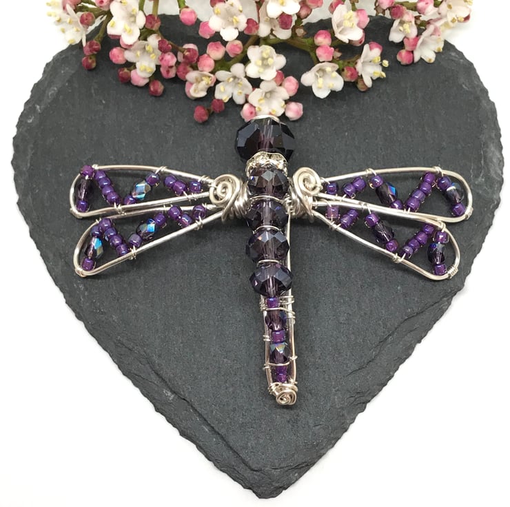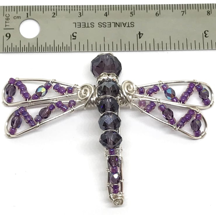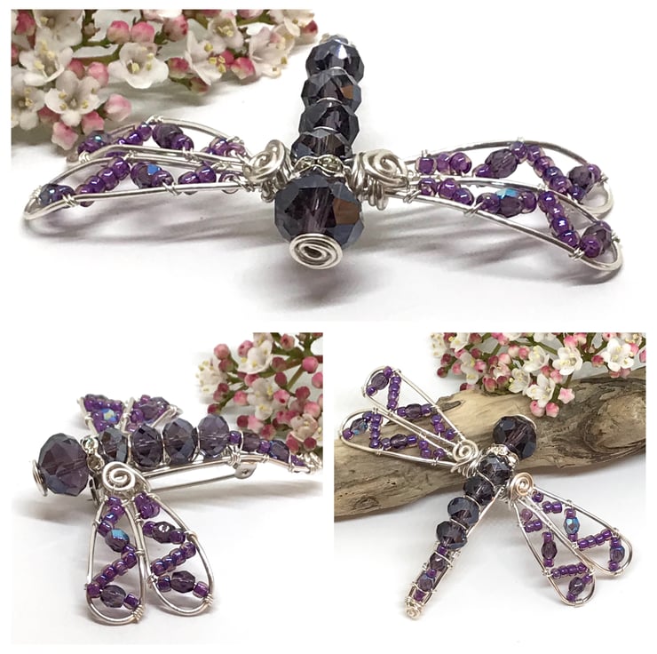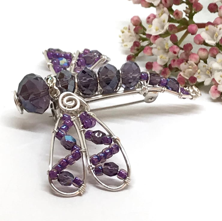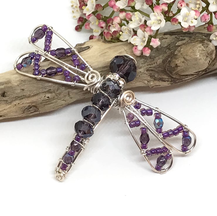 I have formed silver plated wire into a dragonfly shape with swirl detail on the wings. Beautiful purple crystal beads, a rhinestone spacer bead and purple seed beads are added to the body and wrapped around the wings using silver plated wire. The dragonfly is attached to a silver coloured brooch back.