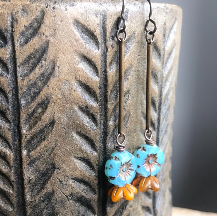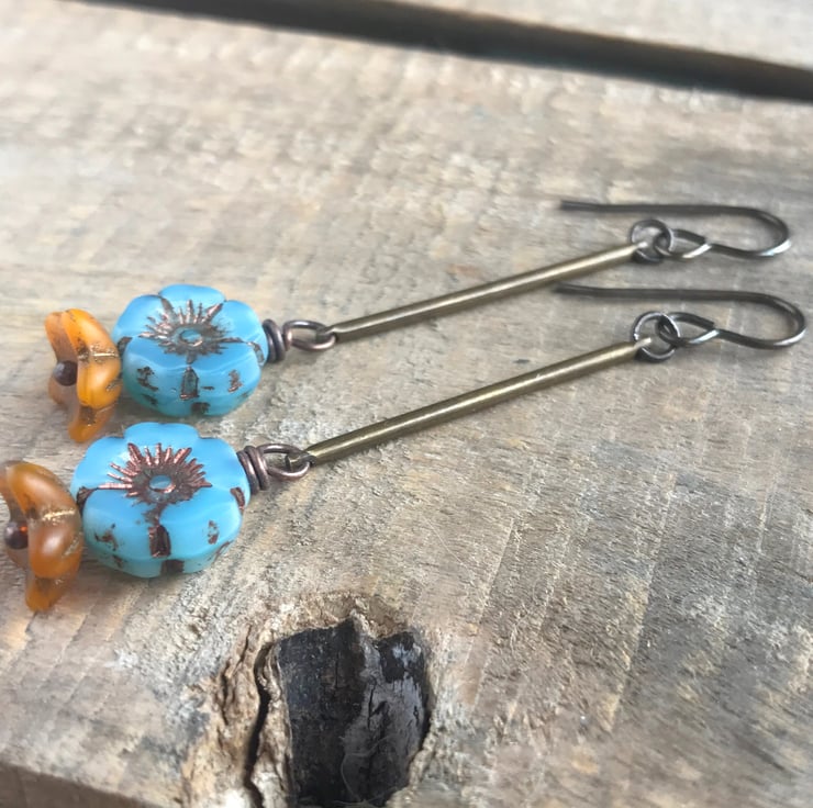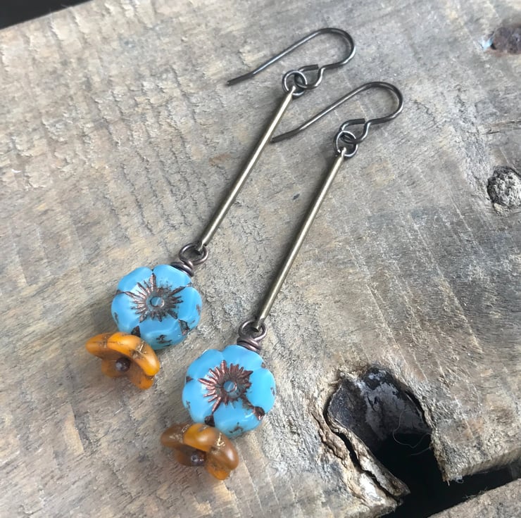 They feature blue flower beads with a subtle satin finish and hints of bronze around the edges. They simply sit on copper ball headpins with contrasting honey-yellow star flowers below.