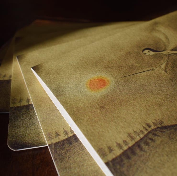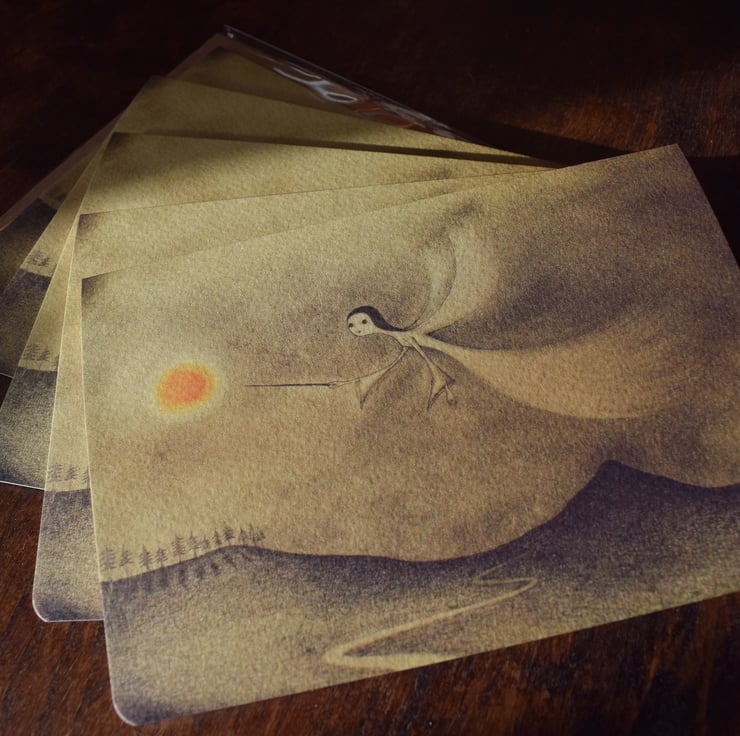 Limited edition Moon Angel Winter Cards by Anne Garner. These A6 illustrations have been professionally printed to textured 250gsm gesso paper with rounded edges, and are supplied with cream recycled envelopes and clear sleeves - ready to light the way for your loved ones this Christmas.