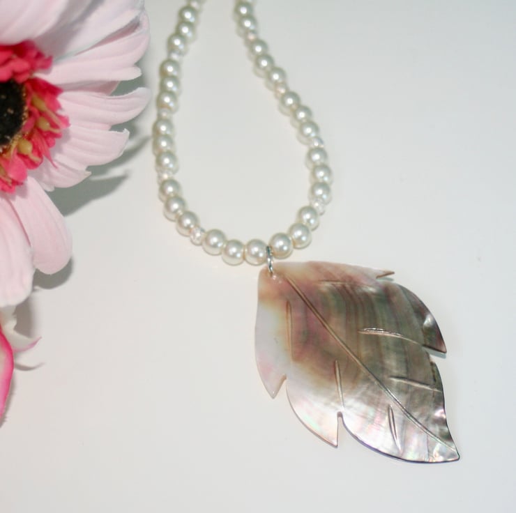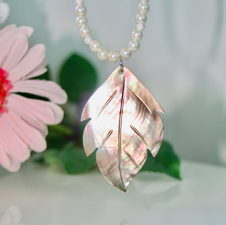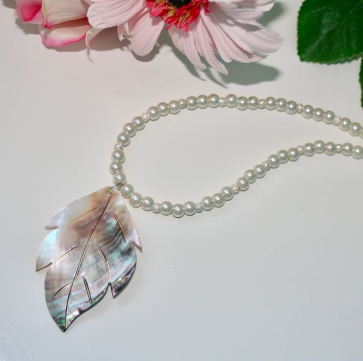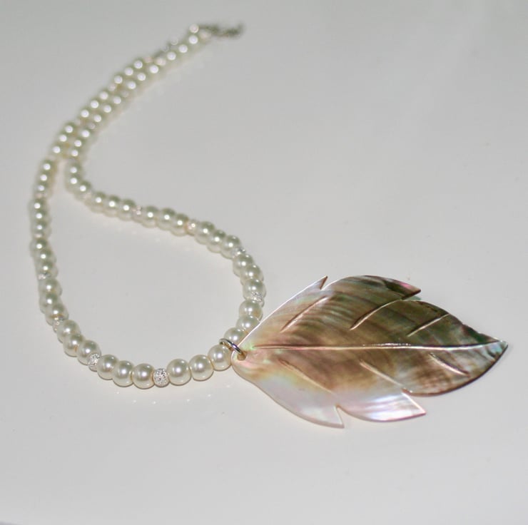 A stunning Mother of Pearl carved leaf pendant hangs from a necklace of glass pearls and sparkling silver plated beads. The leaf has a wonderful pearlescence that is difficult to capture in a photo, you can see this better in the second photo. The colours change as the pendant moves from greys and whites to shimmering greens and silver.