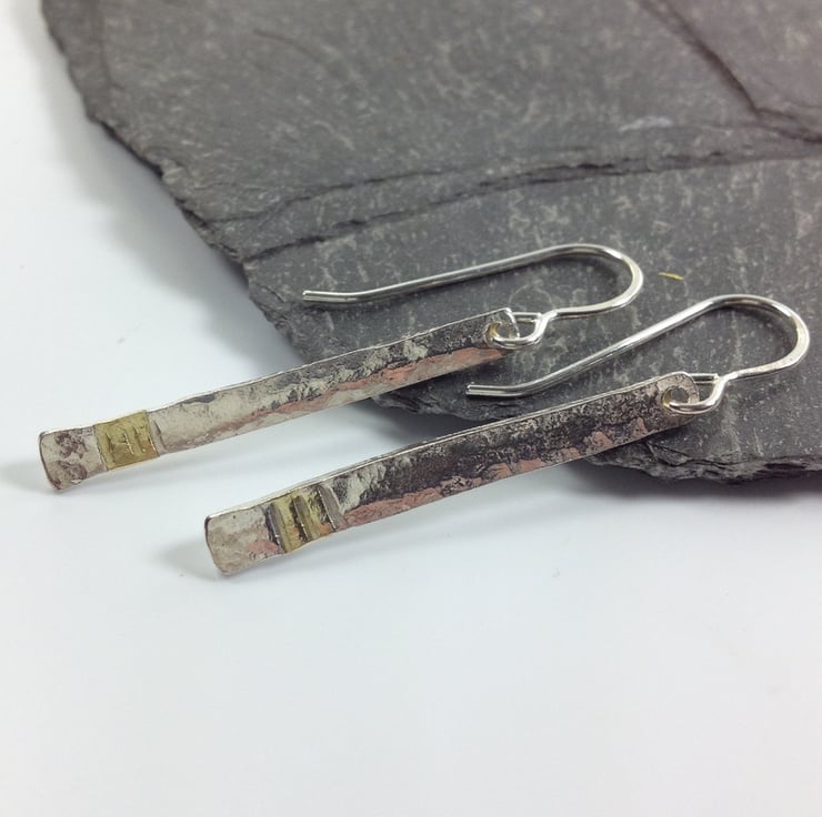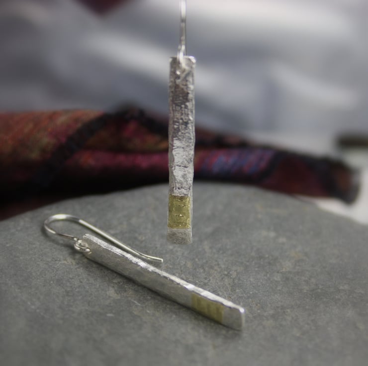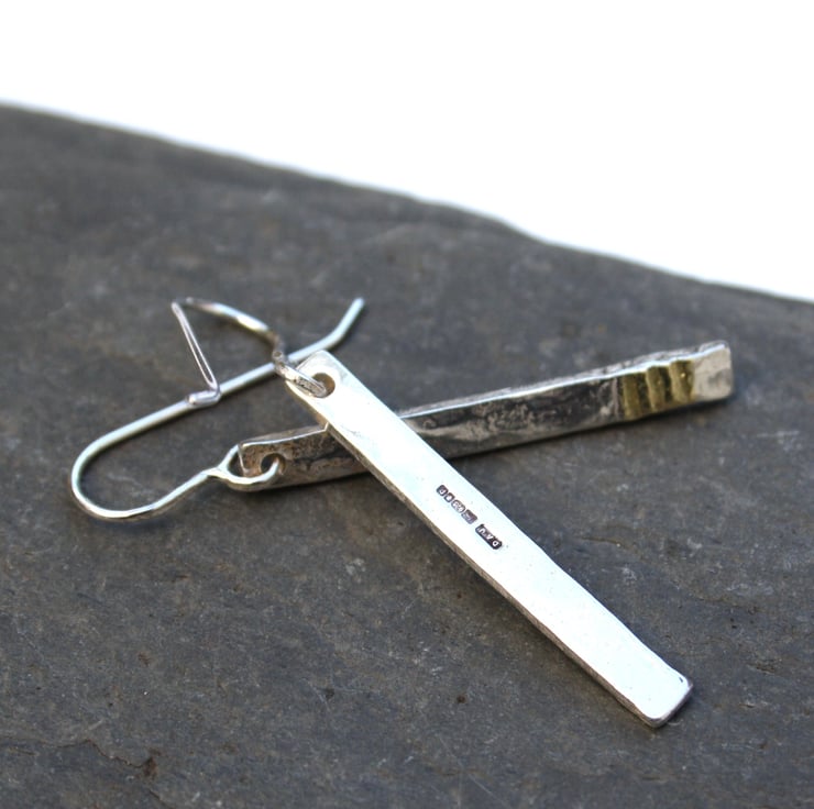 Long silver Pins have been forged and textured with punches, notched and hung on handmade hooks. They have a small fused 18 ct gold details accentuating the notched area.