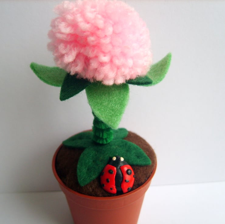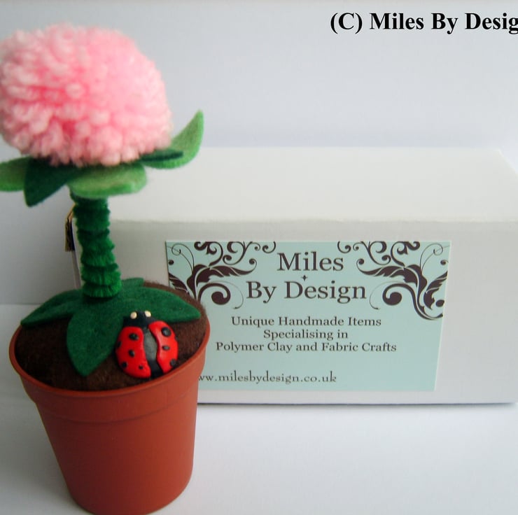 The flower poit is plastic, the flower is made from green felt with a pipe cleaner stem and a pink wool pom pom flower.