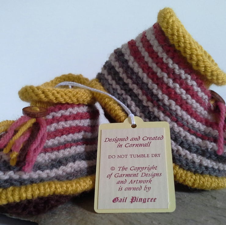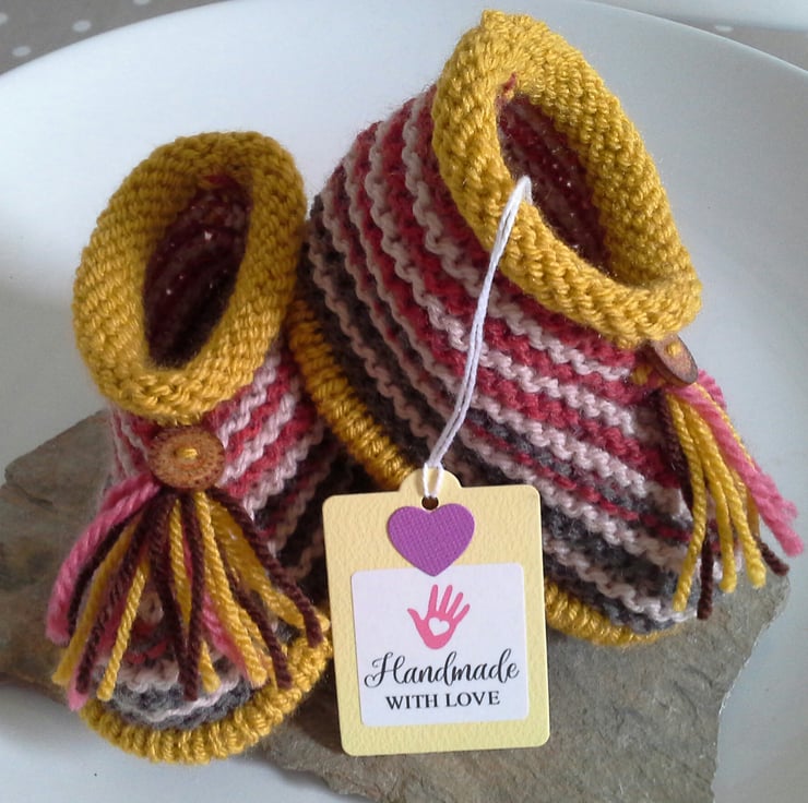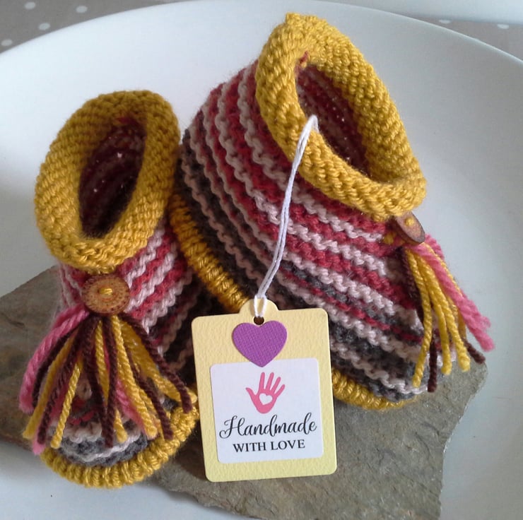 A lovely pair of booties designed and totally hand crafted using quality branded British manufactured yarns containing 25% wool. Each boot has a tassel and a genuine wooden button with a decorative design on them. The trims are firmly hand sewn to each boot for baby's safety, as all baby's have a love for their own feet!