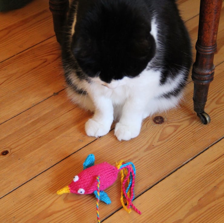 If I knit in the living room. my cat Dizzy always tries to eat my knitting needles! I need to knit in a cat free zone, so usually hide away. I knitted this humming bird for Dizzy to keep her occupied in another room so I can watch my favourite telly programmes!