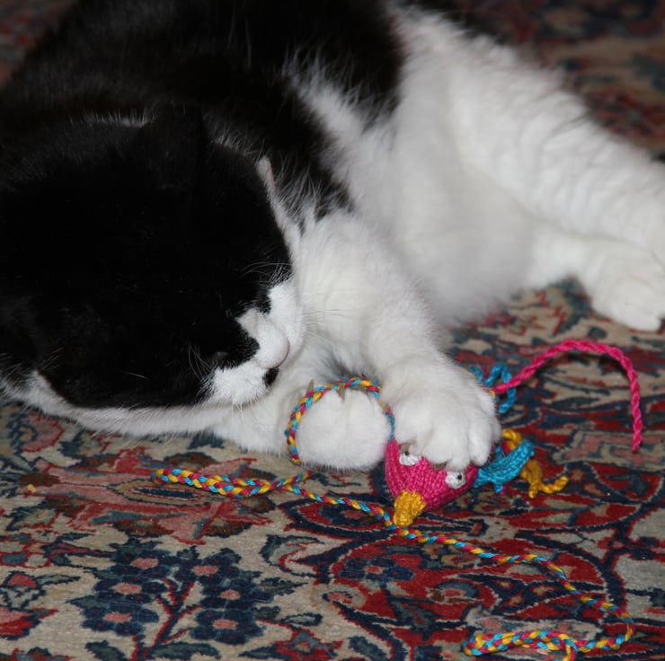 Hand knitted in cotton yarn, so very strong with no fluffy bits to annoy Puss.