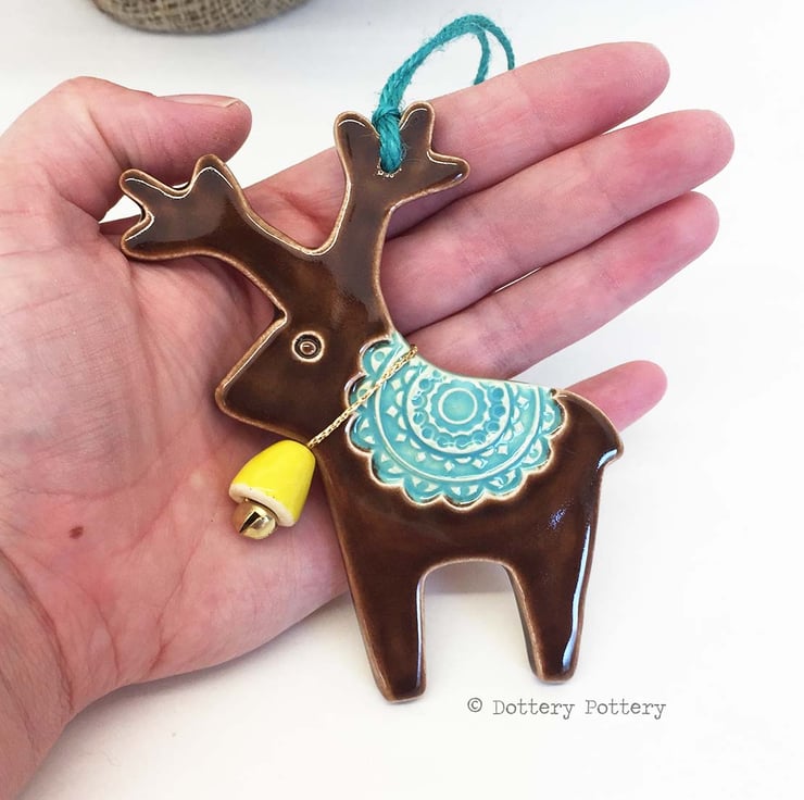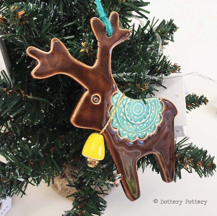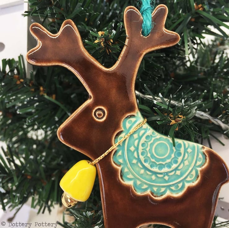 This cute little reindeer is made from white earthenware clay. It is then fired and glazed in a glossy brown gaze, then fired again. It hangs on a teal coloured string and is finished with a little yellow bell - ready to hang on your tree. Each decoration measures 11cm x 9.5cm and is glazed in the front only.