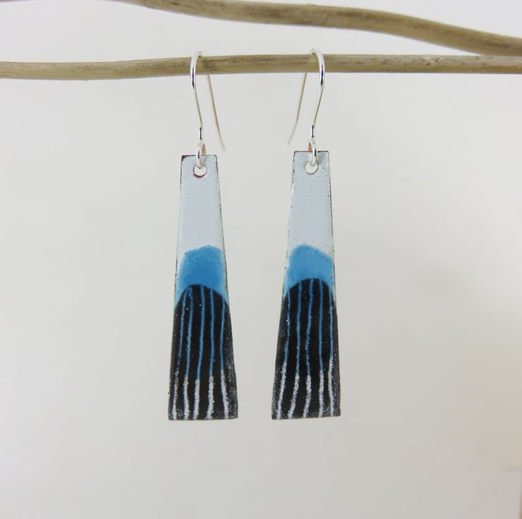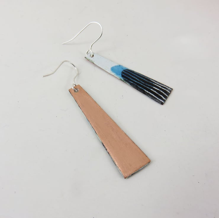 These dangle earrings have a 40mm x 8mm copper rectangle coated in white enamel, hanging on a silver wire. A splodge of turquoise has been painted on the surface followed by a layer of black enamel with hand drawn detail. Fired in the kiln at 830 degrees.