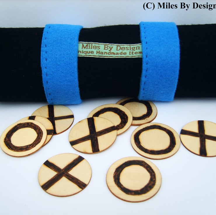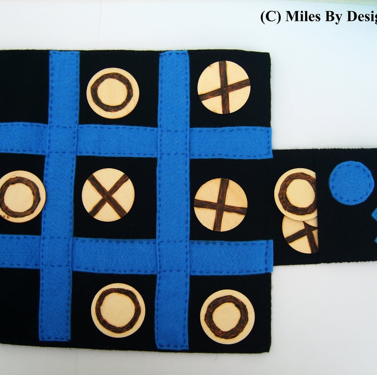 The board has a built-in felt pouch to hold the counters, and it is decorated with a nought & cross.