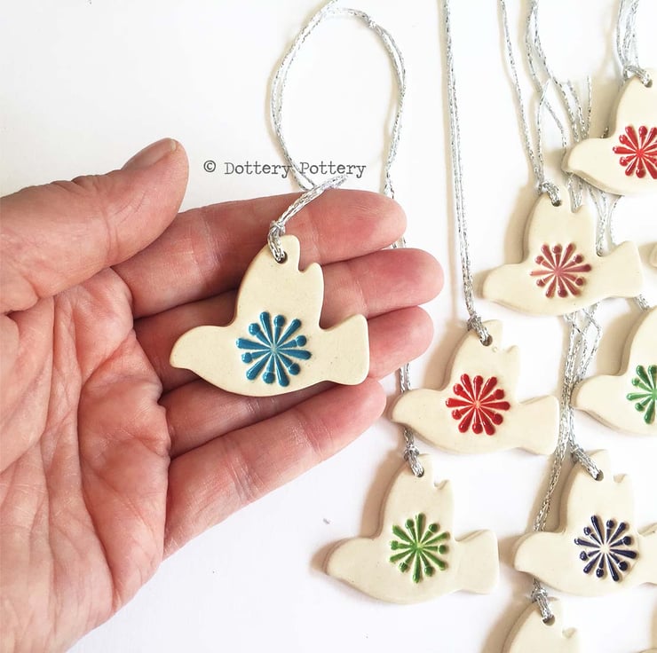 £1.25 each. These little ceramic dove decorations are imprinted with a brightly coloured snowflake pattern and finished in a clear, glossy glaze. You will get one of the various colours when you order and if you order more than one, you will get a selection of different colours - it will be a lucky dip. (you cannot request certain colours - sorry) They measure approx 4cm length and 3.5cm height and 3mm deep and hang from silver string. Glazed on the front only - they are left plain on the back.