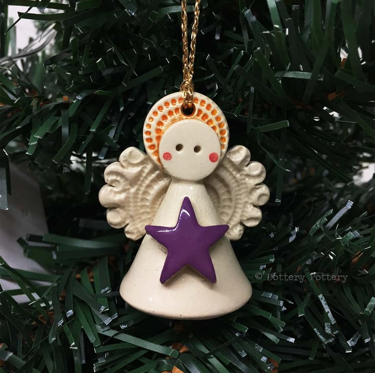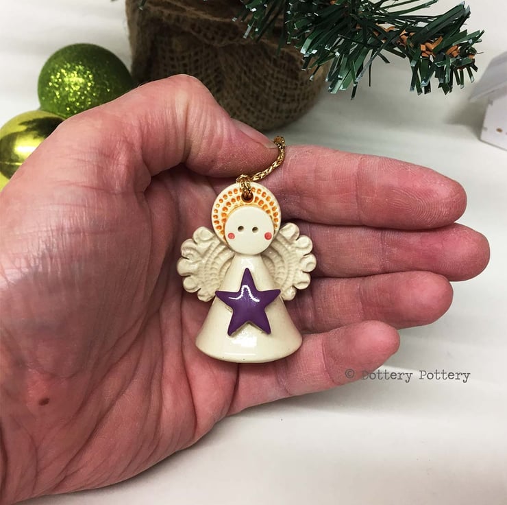 One purple star teeny angel decoration This tiny little angel is made from white earthenware clay. She has a little cream dress and a cute little button at the back. She can hang from the Christmas tree or be a free standing ornament. She measures 5cm high x 4cm wide
