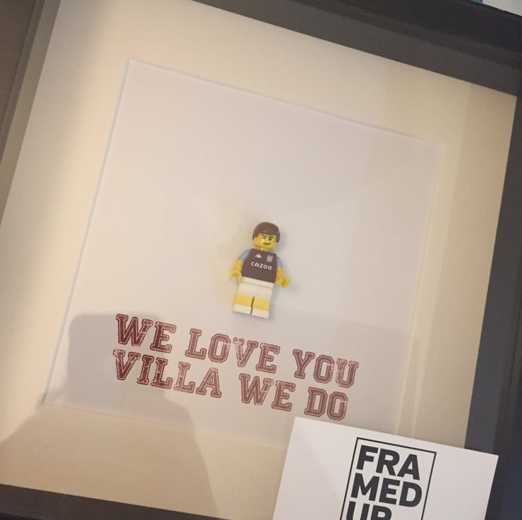Here we present our tribute to Aston Villa Football Club... we have customised a Lego minifigure and kitted him out with the last sat home kit. He had been mounted in to a deep box frame and teamed with the wording 'We love you Villa we do'