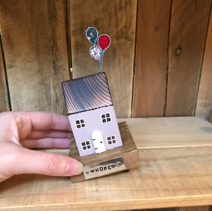 This little hand crafted wooden house is painted pink with wire/fabric balloons in the roof, the house has been made to look like it is being lifted by the balloons!